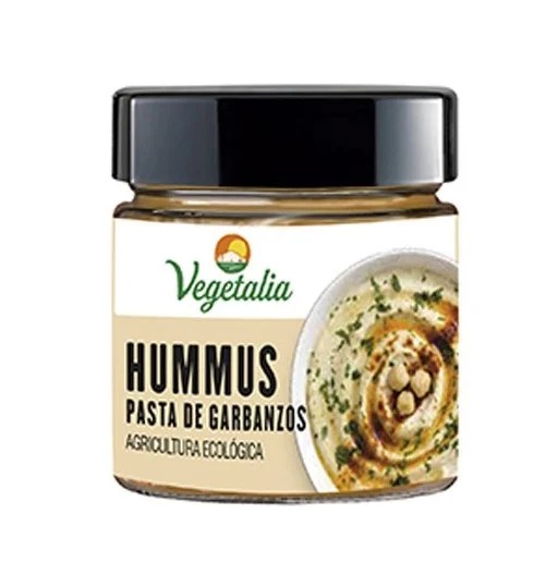 Información del producto: Hummus (paté de garbanzos) ecológico Vegetalia, tarro de 180 g, vegano, sin lactosa y listo para consumir como untable o dip.