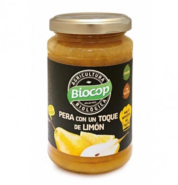 Información del producto: Mermelada/preparado de pera y limón ecológico Biocop, tarro de 280 g, sin gluten, vegano, sin conservantes ni colorantes añadidos.