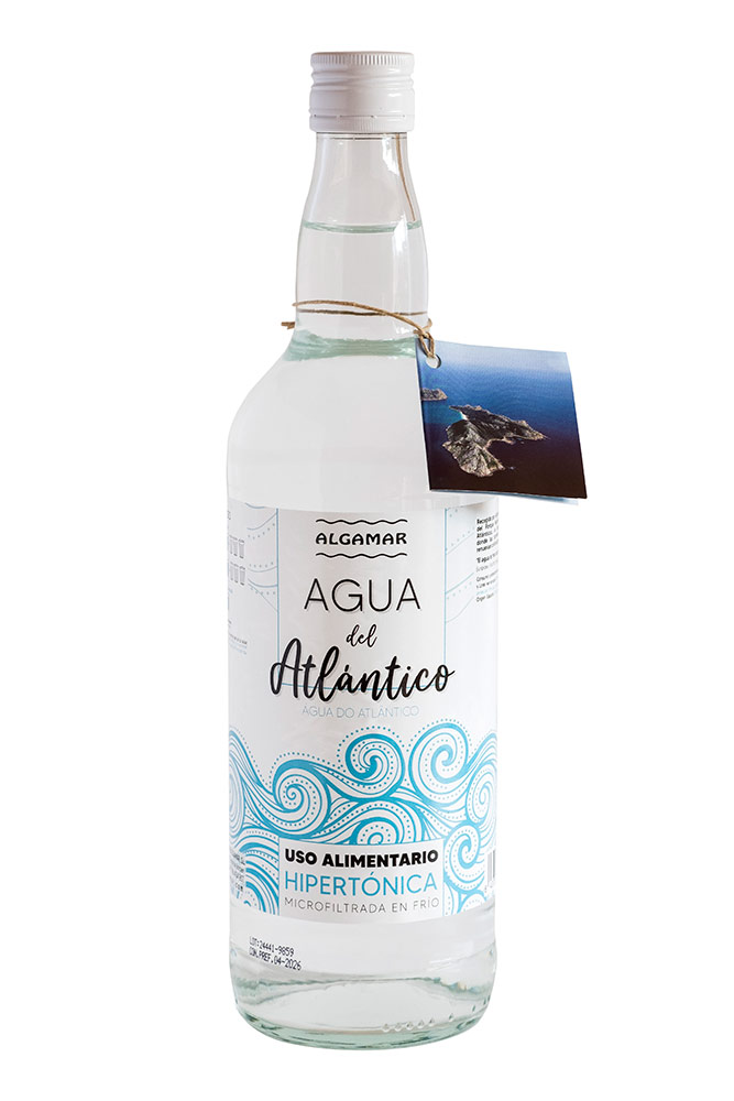 Agua de mar filtrada y apta para consumo alimentario, procedente del océano Atlántico. Utilizada como complemento nutricional y culinario.